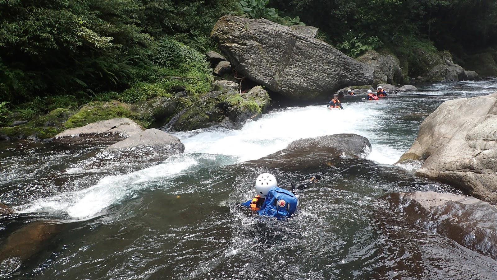 我帶一批人到前方去跳水,漢彰帶另2位女生從左岸下來,幾位比較敢玩的跟海狗去沖激流