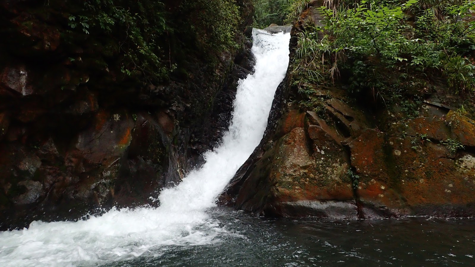 過上一個瀑布開始飄細雨,不過是安全的雨勢,並不擔心,往山邊看去也沒有太大的變化,雨是一陣一陣,有聽到雷聲,評估之後確認來自盆地內,行程繼續,這裡離可撤退的匯流口也不遠,隨時可撤。
