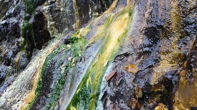 上10米瀑不久,往前走一些右手邊有兩道溫泉瀑布,其中一道往上看可以看到大片綠色結晶,上一回不知道錯過,回來經朋友告知才知道有這麼一處,這次有特別注意,爬上去站在旁邊身體都暖了,舒服。